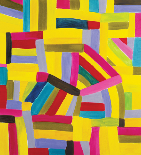 Oliver (1996)—the title is a tribute to her first child—is unusual in avoiding the Rothkoesque coloured cloud or 'lozenge in space' format that has become Brennan's trademark. A minority of her works deal with the grid—that icon of twentieth-century abstraction from Mondrian on—by drawing black lines around fields of bright, acidic colour. Oliver, however, is constructed from short coloured blocks, like parquet or cuisenaire rods, laid side to side. There is no blank canvas or empty space: unusually for Brennan in the mid-1990s, the whole surface is intensely charged with colour; the breezy yellows preclude a sense of claustrophobi . The definiteness of Brennan's vertical/horizontal grid is also given a twist, with triangular arrays of blocks and heavy diagonals that make the picture's middle spin like a vortex.