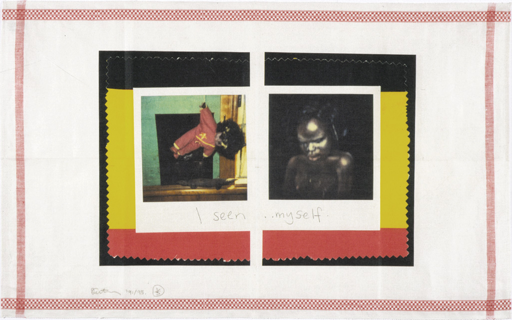 Deacon's nation is Kuku from far north Queensland and Erub, Mer in the Torres Strait Islands. She was born in Maryborough, Queensland and after an itinerant early childhood—her father was a wharfie always on the lookout for work—she grew up in inner-city Melbourne. Her 1998 work Postcards from mummy documents the artist's trip retracing her mother's journey 'from Cooktown to Brisbane'3 after she left Darnley Island and before she met Deacon's father. For the artist, who is 'bloody terrified of the bush',4 it is a landscape both foreign and ominous, beautiful and removed, captured in snapshots largely taken from a car window—souvenirs for a tourist in her own country.