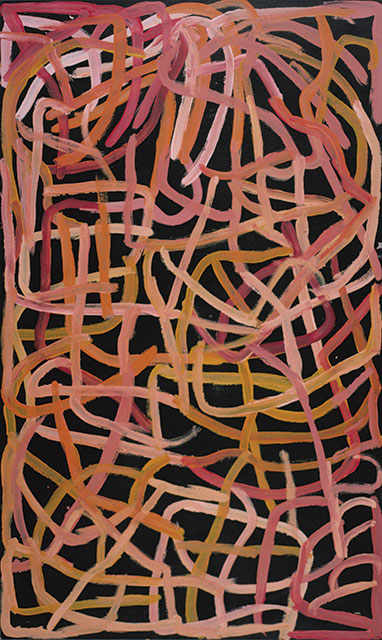 Kame colour VI (1995) exemplifies the latter style. The artist painted on unstretched canvas laid directly on the ground at Utopia Station, working in from the edges, seated cross-legged and reaching into the black field with a long brush. Like most Central Desert painting, the work has no right way up. From Kngwarreye's perspective the subject had rich mythic meaning, but she did not reveal the Yam story. The plant itself is a prized food-source, retrievable by women skilled in reading the signs of its hidden presence and armed with long digging-sticks. Emily's pink and orange brushstrokes—graceful in profile but tense in execution—are thought to relate to the growth patterns of the yam roots under the ground and the way the ground cracks in certain places when the tuber is ripe for gathering.