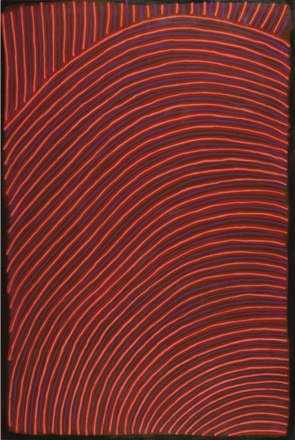 Unlike Kngwarray, who more or less moved through a progression of styles (with aberrations), Petyarr works simultaneously in several, disparate styles, producing works so diverse it is hard to believe they are by the same hand. Body design (1997) is an example of works based on the designs of body painting. Unlike Petyarr's earlier works, in which designs intended for the body were transferred 'as if lifted off the body and applied to the canvas'4, the enlargement of this thumbprint-like image suggests a design thought out in terms of canvas rather than the body. The vibrant collision of closely related colours lends a vivacity to the image, filling the picture plane with an energy and authority commensurate with the confidence of an artist of Petyarr's seniority. More recently, Petyarr has evolved a feathery style of painting in which she invokes the effects of wind on the grasses and leaves of the desert—remarkable canvases which, in their return to the shimmering movement of silk, breathe the life of her country.
