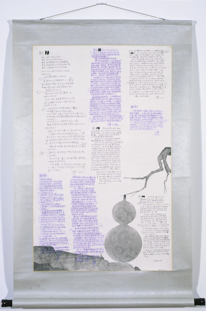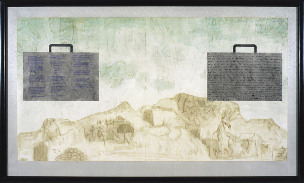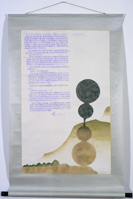 Double gourd (1997), Heavy gourd (1997) and Landscape with two suitcases (1997) were all produced during a residency at the Beijing Academy of Art. Travelling in Shanxi and Shaanxi provinces with artist Feng Yong, Pryor responded directly to the landscape. After Pryor had painted on scrolls, he passed them on to Feng Yong for his 'response'. As Feng Yong reported, Pryor was happy for cultural exchange to take place on a human level, nor was he afraid to make a scene of himself. 'He begins drawing the mountain, but he is soon surrounded by curious children ... He gives each of them a metal kangaroo badge and then he starts bounding around like one, shrieking "Australia!", "Australia!"'.5