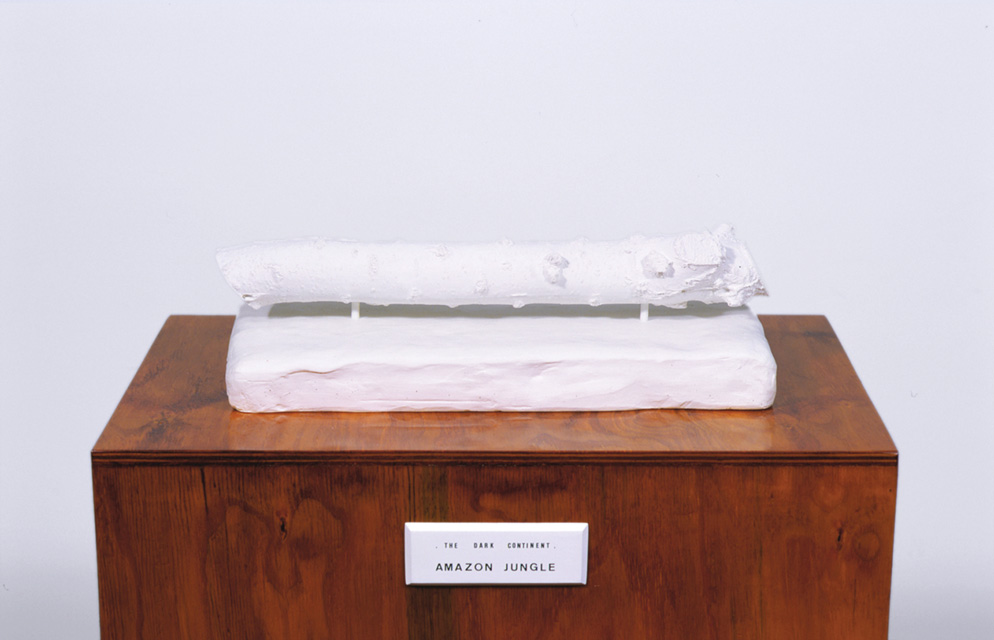 The dark continent: Amazon Jungle and The dark continent: Grand Canyon (both 1994) offer the museum visitor scale models of vast geographical territories. Pathetically small in contrast to the reality that they invoke, these pale, washed-out fragments are clearly a poor substitute for the real thing. While the formalities of the label and the plinth confer a sense of ceremony and significance on the objects, Nelson seems to suggest that the tricks of the museum trade will never be enough to bridge the void between the world 'out there' and the faint echoes of it that we hear in art.