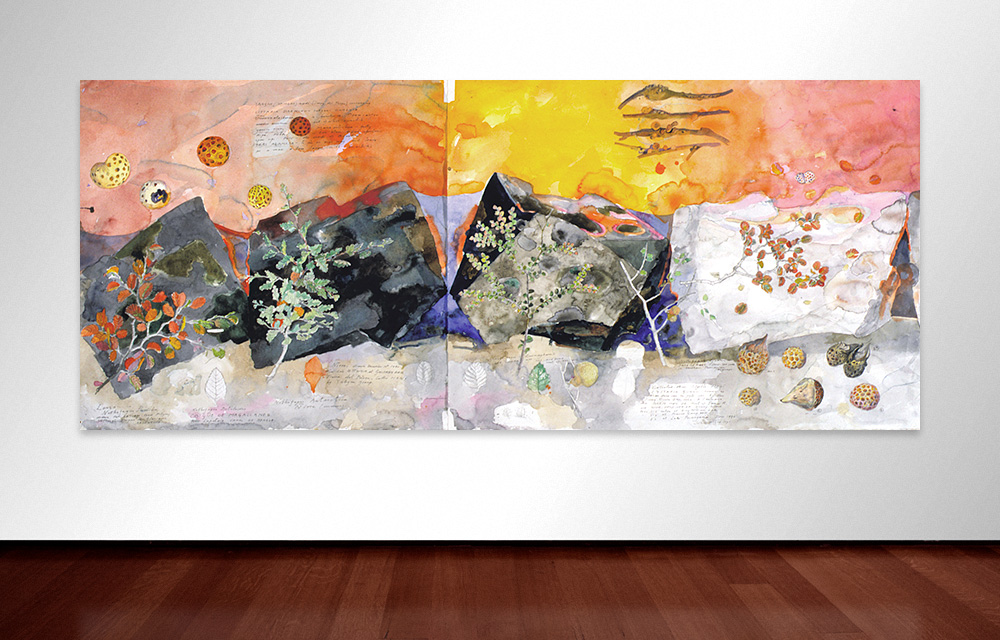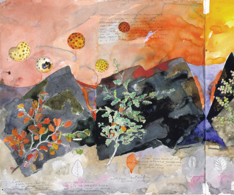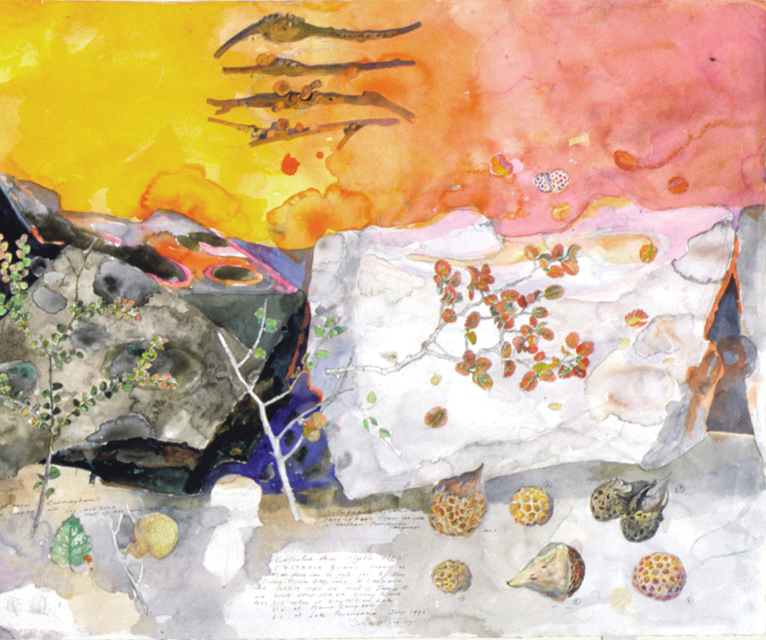 Site and location is everything for Wolseley, whether it be the Simpson Desert or Lombok. Indeed, whatever location he selects, the history, geology, topography and flora and fauna must be collated and recorded. The gentle watercolour The spore bearing bodies of Cyttaria in Tasmania and Patagonia and their Nothofagus hosts (1996) reflects a fascination, indeed even an obsession, with the similarities between two sites at the opposite sides of the world—the glacial vistas in Tasmania and Patagonia—that were once joined as part of the Gondwana supercontinent.