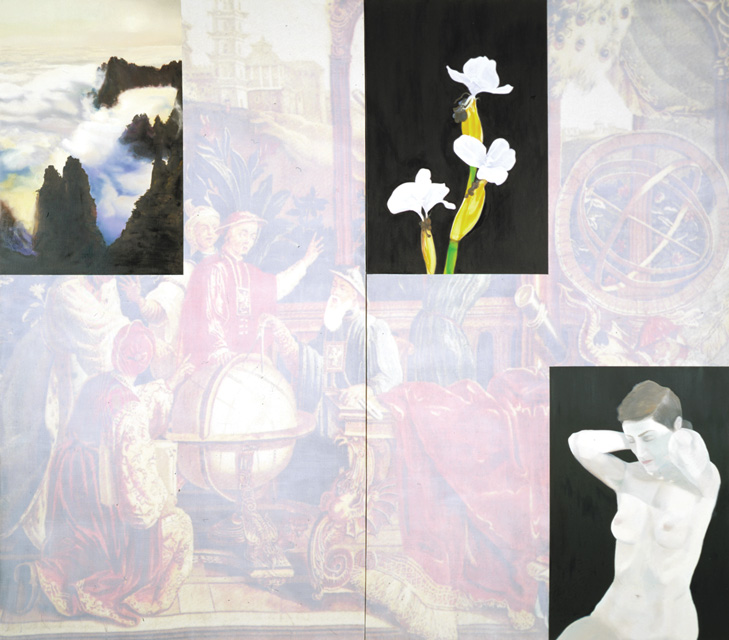The other ground comprises three painted images from three western genres: the nude, the still life and the landscape. While the scanned image contains a narrative, the painted images represent a mood more than a story. The nude is appropriated from a 1950s book of photographic studies by John Everard. Although Everard’s nudes had an educational purpose, they also have a hokey soft-porn ambience. In On liberty #1, they serve to drive the point that edification makes a great disguise for dubious causes, adding to the work’s critical position in relation to the Jesuit's exchange with the Emperor.