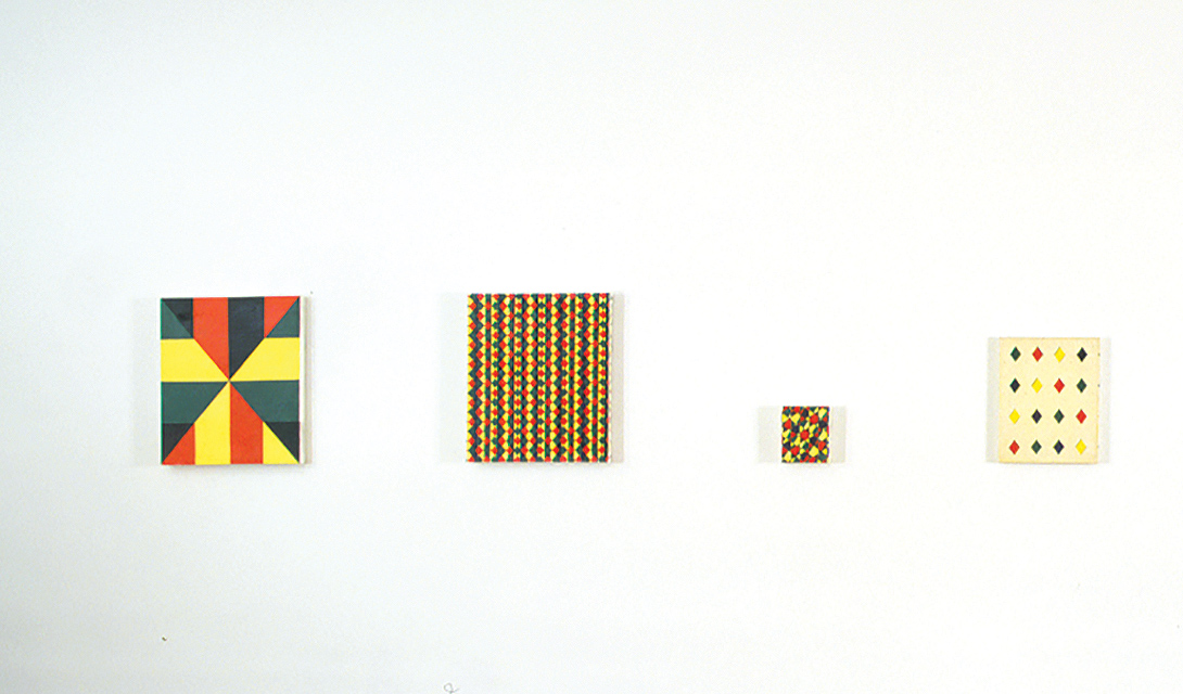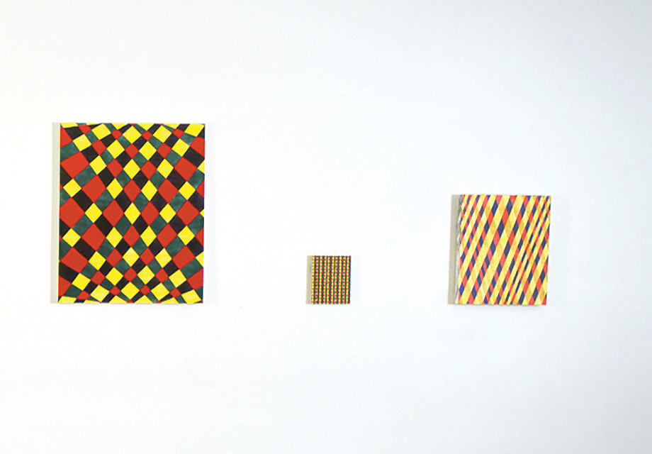 While the genre of geometric abstraction lives with the constant threat of formal and conceptual parameters deadening the surface, Poliness finds ways to reinvigorate the use of pattern. Her grids leap and buck, alternating between large swathes of colour and tiny, meticulous constructions.