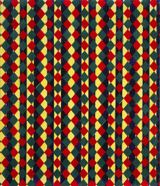 Although there are, of course, exceptions, geometric abstraction has largely been the realm of the heroic male. The infusion of the feminine into this realm in Poliness's work is hinted at in the playful, at times meandering, approach to pattern-making. There is little sense of pretension here. Poliness is creating modernist grid painting for mass consumption. As Carolyn Barnes has noted: