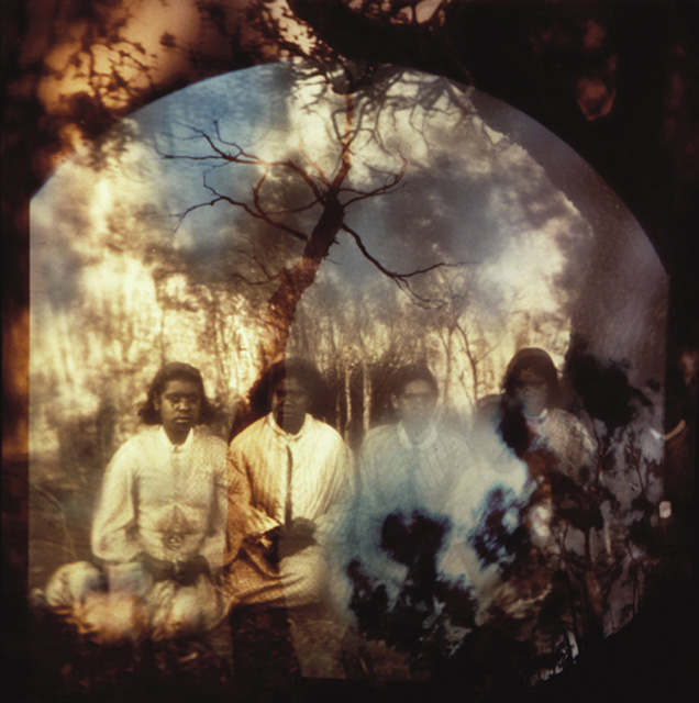 In this series, King-Smith has superimposed archival images over her own photographs of the Victorian landscape. Parts of the image have been painted over, then the whole rephotographed and printed in large-scale Cibachrome. Contra to the reductions of anthropological classification, the artist remystifies the land by literally haunting it. Yet while the images seek to animate the equation of land and self that is so central to Aboriginal culture, they do not so much present 'patterns of connection' as of alienation. The figures that ghost the landscape—Aboriginal people dressed in rags and mission whites—fade at the edges, are just out of reach. The closed space between the figures and the landscape, between the received image and its resuscitation, contains a past that is ungraspable, an abruption of memory. The unpeopled landscape may host a natural religion, but in King-Smith's scheme it is one without practitioners: the darkness from which the images emerge is the darkness carried by one born without a mother tongue.