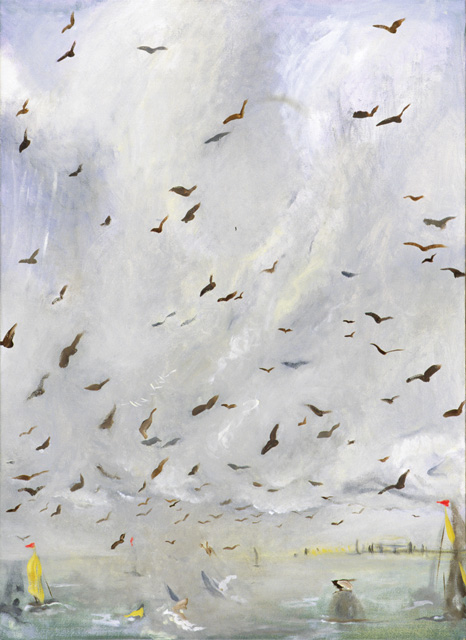 Marrinon's wit, and her determined exploration of art historical genres (portraiture, landscape, figure painting, still life), reveal an artist preoccupied with art's status in a culture brimming over with visual stimuli. In what ways, she seems to ask, can a painting compete with a holiday snap, an advertisement, a movie or a fashion shoot—much less with other paintings? Will art's values and categories remain intact in the face of contemporary visual culture's disregard for conventions? Asking such questions doesn't make Marrinon defensive or conservative; she is as inclined to mix and match visual styles as any art director. But she does exploit the way in which art encourages viewers to dwell on visual stimuli. Nude with green bottles explores surface decoration, Standing figure with clouds seduces with sinuous contours and Birds at Point Lonsdale is loaded with small traces of the physicality of paint and its application. Marrinon's defence of art rests on her display of its particular pleasures, even as she admits that other forms of pleasure (cartoons, calendars and fashion) are equally appealing.