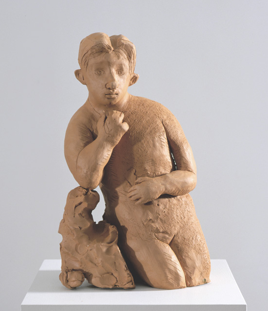 As is the case in her paintings, Marrinon's sculptures play with cultural categories: high culture and mass culture, the gallery and the home, art and decoration, good taste and kitsch. Standing figure with clouds seems to invoke the high aspirations of art; a classical pose and a contemplative figure suggest meditation, romanticism and transcendence. But at the same time, these allusions are undercut by the cartoon-like forms and the domestic scale of the piece. The work hovers on the border between museum artefact and mantelpiece knick-knack. This confusion of categories is typical of a tendency for 1990s artists to reject orthodox classifications in favour of a more liberal and pluralistic approach to culture. It echoes a spirit common to post-modernist practices: the refusal of the 'heroic and original' in favour of the 'ugly and ordinary'. But Marrinon targets more than cultural categories themselves; she also takes on gender categories. Her figures are generally male but are presented in ways that gently mock masculine roles. In Standing figure with clouds, she converts the classical philosopher or romantic poet into a sensitive new age guy. In doing so, she charts the genealogy of a 1990s version of masculinity, but also, quite literally, cuts it down to size; her dreamer is brought back to earth with a humorous thud.