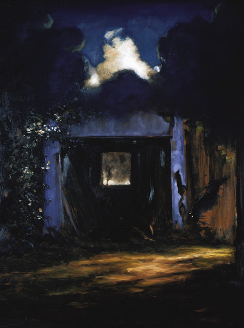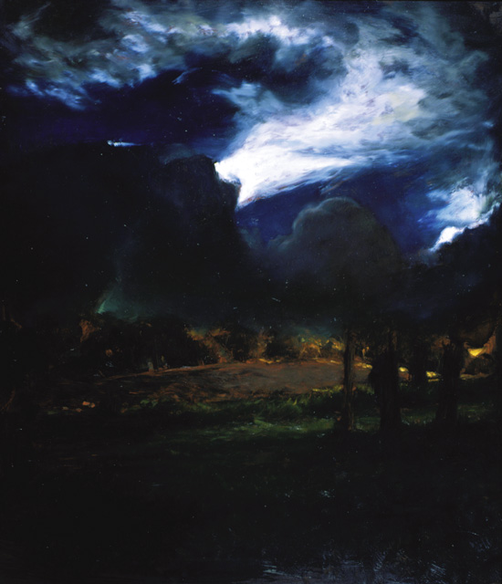 There is a sense of impending events or recently concealed misadventure in these works. In Untitled #540 (1997), partially hidden in shadows, the witness could be closing in on a crypt, a cavernous entrance made visible by the watery light of the moon. In Untitled #539 (1997), the pot of gold at the end of the rainbow is obscured in inky blackness. The odd light and threatening clouds suggesting an arduous, perhaps impossible, journey. Similarly, in Untitled #546 (1997), the sky-scape takes on Wagnerian proportions.