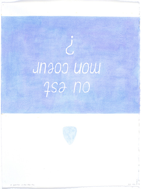 There is something ghost-like about the works of Rosslynd Piggott, something ungraspable, as though these works are apparitions. They are there, but at the same time not quite there. It is as though your hand would pass right through the canvas or object, not leaving a mark. In A question in the blue sky (1994), the question 'Où est mon cœur?' (Where is my heart?) floats lightly in the gentle nothingness of the bleached and watery sky. In the imagination it drifts, a surreal and specific cloud form which will, with a little time, disperse, leaving the sky untarnished.