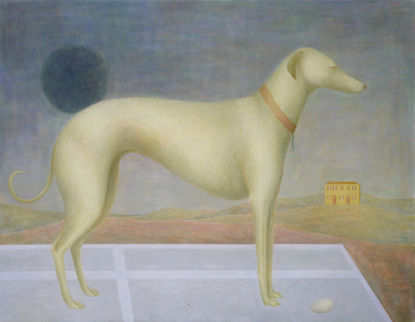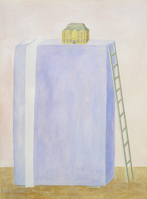 When one sinks into Dark sun, Tuscany (1993) that is precisely the experience one imagines Piggott having. Boyd's villa sits oddly in the background while a dog and an egg on a tennis court, quite naturally out of scale, dominate the picture plane, the dark sun hovering, casting a greyish light. Piggott's muted pastel palette is an obvious reference to the faded colouration of the Renaissance artists she was so avidly contemplating. But unlike the Renaissance artists, both scale and logic go out the window here. High bed and maison Parisienne (1995) depicts a villa atop a vertical shape accessible via a ladder. Nothing is in scale: a villa too small for the bed and too small to accommodate its occupant.
