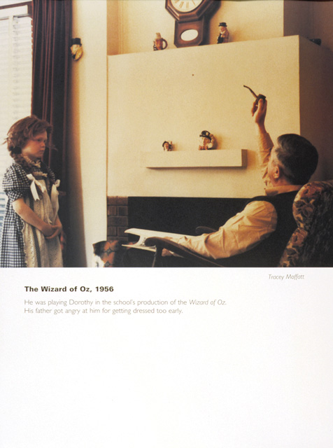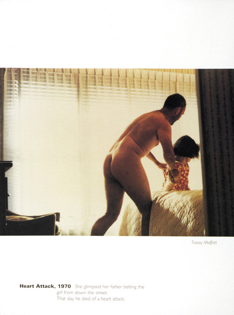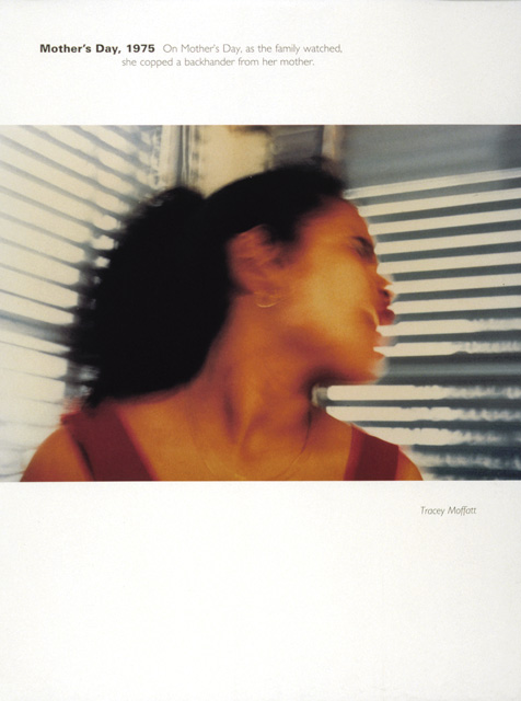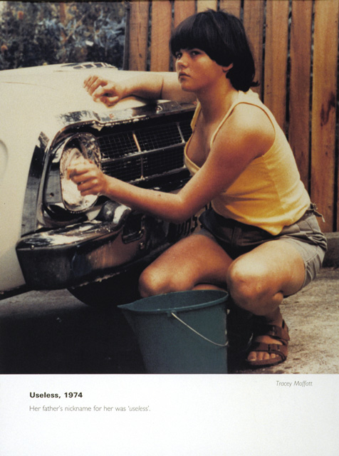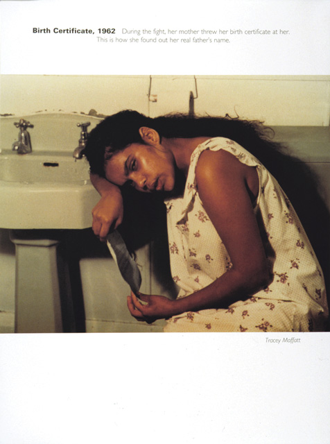 It was with the 1989 series Something more that Moffatt sprang to international prominence. The large, brightly coloured Cibachrome images depict the unsuccessful attempt of a beautiful woman (with Moffatt herself, with more than a hint of Hollywood melodrama, taking on the role of protagonist) to seek a better life in a large city. From the same year, the 35 mm film Night cries: a rural tragedy depicted the complex love–hate relationship between an elderly white woman and her half-Aboriginal child. The images depicted in Scarred for life (1994) are universally recognisable as snapshots of bitterly traumatic childhood memories: a girl washing a car, two kids playing, sisters who dress up to go out. Moffatt's captions make for a harrowing effect: 'Her father's nickname for her was Useless'.