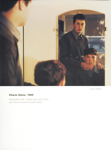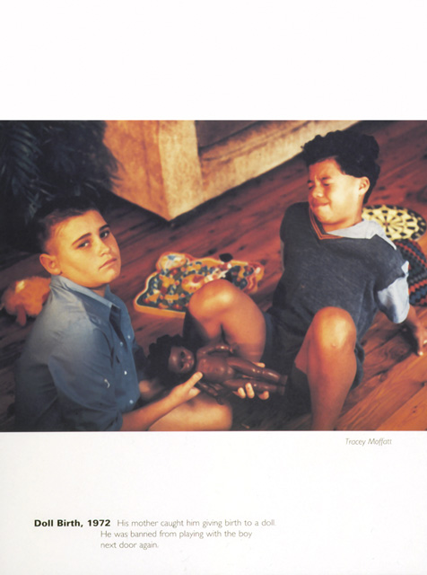 'The Scarred for life series is a series of images about tragic, funny tales of childhood, all true stories told to me by friends,' Moffatt has said. 'The images are just so ordinary, and the artwork itself doesn't even look like art. It looks like pages in a magazine. It became such a smash hit. I couldn’t understand why, but I think it’s because everyone has a tragic tale to tell. Over the years people have come up to me ... they couldn't wait to tell me their tragic story.'1 Childhood and a nostalgia for the past is an ongoing theme in Australian art: a yearning for an idealised past that never occurred. Teenage years, in theory, should be full of discovery and fun, but the discoveries here are decidedly bleak.