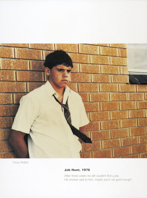 The images are structured to reflect the graphic conventions of Life and similar magazines from the 1960s and early 1970s. Moffatt's use of a 'retro' style utilising filmic poses, 1960s magazine-style designs and flashbacks seems to only hammer home the harshness of her themes rather than soften them through a mist of nostalgia. Themes of conflict and force, life and death, love and sexuality run like a savage thread through Moffatt's work. They reflect the struggle on the underside of Australian society, and the strained relations between men, women and children.